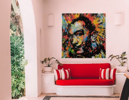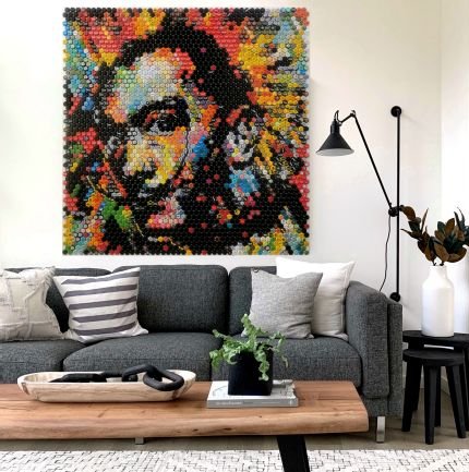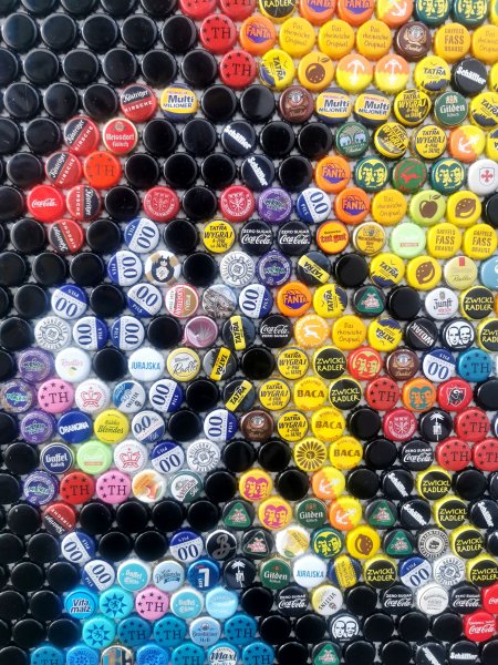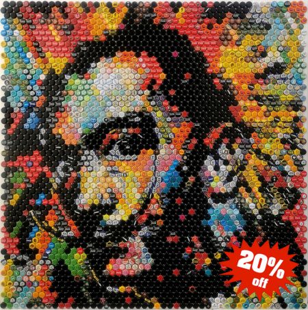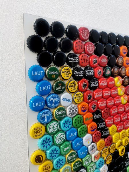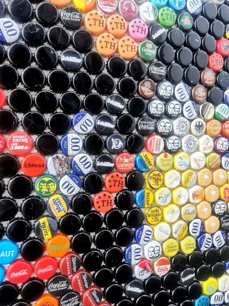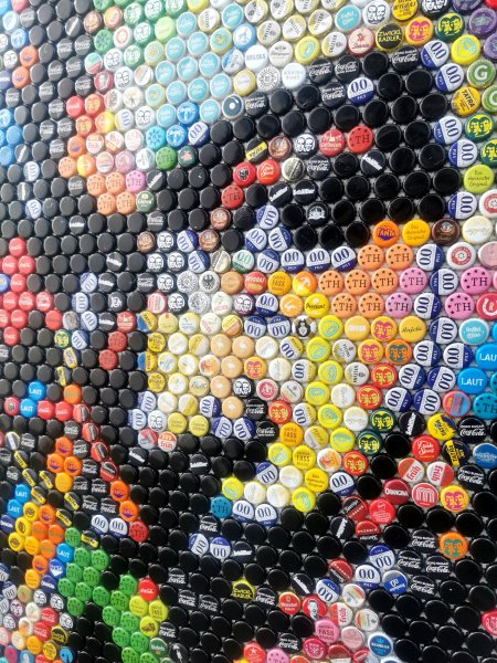 Materialität und Technik:Die Wahl der Kronkorken als Medium ist sowohl subversiv als auch poetisch. Alltagsabfall wird hier zum Trägermaterial einer Ikone der Kunstgeschichte. Die industrielle, harte Textur der Metallkappen kontrastiert mit der Weichheit und dem Surrealismus, für den Dalí berühmt ist. Zugleich erinnert die Mosaik-Technik an klassische Ikonenmalerei, nur dass die „Steinchen“ durch glänzende, bedruckte Oberflächen ersetzt wurden.