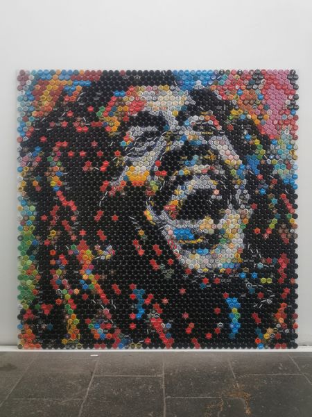 Das Werk „Bob Marley“, entsanden im September 2025, besteht aus 2.630 Kronkorken, die zu einem farbintensiven Mosaik arrangiert wurden. Dargestellt ist das ikonische, lachende Gesicht des Musikers, dessen Ausdruckskraft durch die besondere Materialwahl noch verstärkt wird.