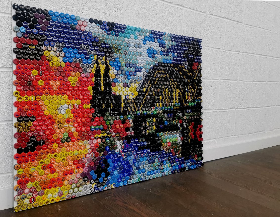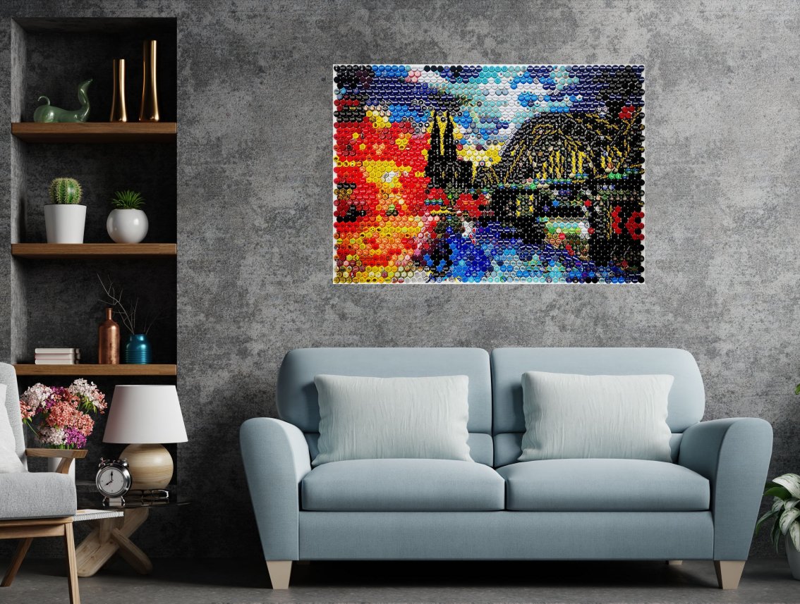 Irgendwie ist der Kölner Dom ja auch ein "Star" und reiht sich somit gebührend in die "Stars and Caps" Reihe mit ein. Das Kunstwerk in der Größe 140cm x 98cm, bestehend aus beeindruckenden 1.840 Kronkorken, fängt auf faszinierende Weise die ikonische Skyline von Köln ein und zeigt dabei den majestätischen Kölner Dom sowie die prägnante Hohenzollernbrücke im Hintergrund eines warmen Sonnenuntergangs. Das Kunstwerk schafft es, den Charme und die Magie der Stadt auf außergewöhnliche Weise einzufangen und lädt dazu ein, die Stadt Köln aus einem ganz neuen Blickwinkel zu erleben. Ein Meisterwerk der modernen Recyclingkunst, das sowohl ästhetisch als auch symbolisch tief beeindruckt. Das Kunstwerk wird erstmals der Öffentlichkeit und den Besuchern am 02.11.2024 im Rahmen der Museumsnacht Köln präsentiert.