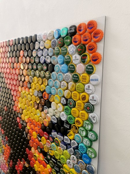Materialität und Technik:Die Wahl der Kronkorken als Medium ist sowohl subversiv als auch poetisch. Alltagsabfall wird hier zum Trägermaterial einer Ikone der Kunstgeschichte. Die industrielle, harte Textur der Metallkappen kontrastiert mit der Weichheit und dem Surrealismus, für den Dalí berühmt ist. Zugleich erinnert die Mosaik-Technik an klassische Ikonenmalerei, nur dass die „Steinchen“ durch glänzende, bedruckte Oberflächen ersetzt wurden.