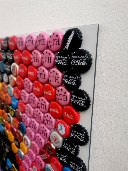 Das Werk „Bob Marley“, entsanden im September 2025, besteht aus 2.630 Kronkorken, die zu einem farbintensiven Mosaik arrangiert wurden. Dargestellt ist das ikonische, lachende Gesicht des Musikers, dessen Ausdruckskraft durch die besondere Materialwahl noch verstärkt wird.