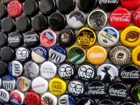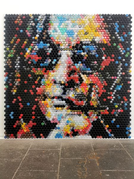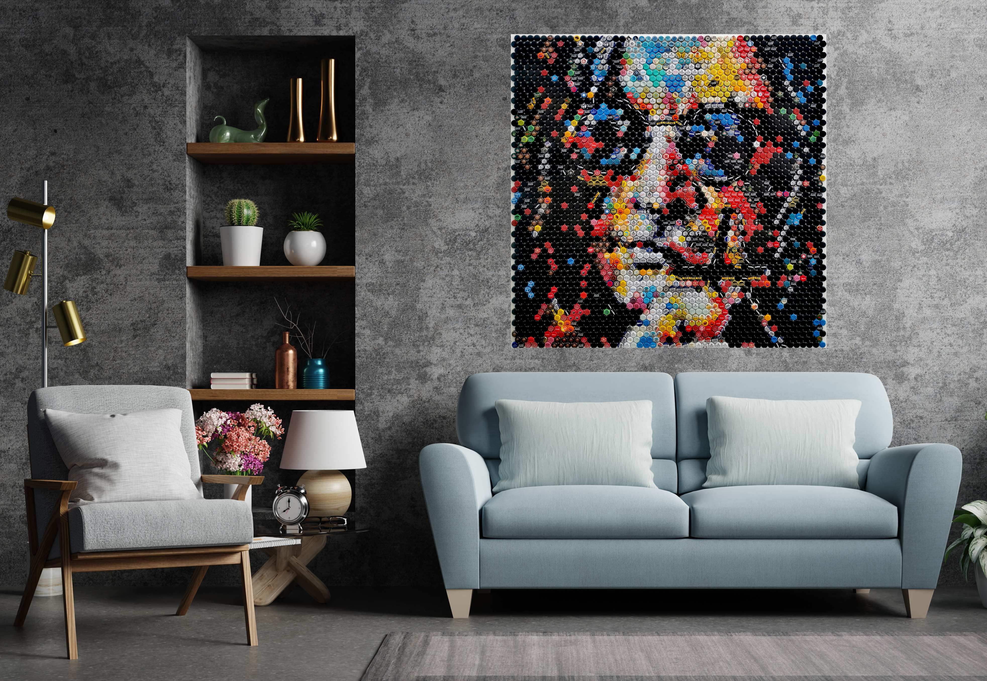 Die vorherrschenden Farben – Rot, Schwarz, Gelb, Weiß und Blau in unterschiedlichsten Nuancen – erzeugen eine dynamische, fast pulsierende Bildsprache. Das Schwarz formt die Konturen, während die kräftigen Rottöne mit dem warmen Gelb und den kühlen Blautönen kontrastieren. Weiß wirkt als Lichtquelle und lässt die Züge hervortreten. Aus der Nähe erkennt man die Vielfalt der einzelnen Kronkorken, mit ihren Logos und Beschriftungen, die das Werk zugleich chaotisch und detailreich wirken lassen. Aus der Distanz verschmilzt dieses Chaos zu einem präzisen, eindrucksvollen Porträt.Im Mittelpunkt steht Ozzy Osbourne, der „Prince of Darkness“ – Rocklegende, Mitbegründer von Black Sabbath und später erfolgreicher Solokünstler. Seine Musik gilt als Geburtsstunde des Heavy Metal und beeinflusste Generationen von Musiker:innen. Mit Hits wie Paranoid, Crazy Train oder Mr. Crowley schrieb er Musikgeschichte, immer begleitet von seiner exzentrischen Persönlichkeit und seinem Hang zum Exzess. Doch Ozzy verkörpert auch Wandlungsfähigkeit und Überlebenskraft – trotz zahlreicher Skandale, gesundheitlicher Rückschläge und einer jahrzehntelangen Karriere bleibt er eine lebende Legende.