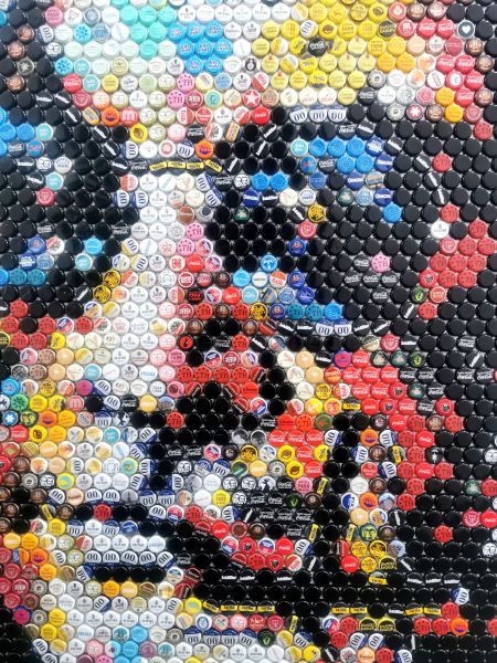 Das Werk „Iron Man“ ist weit mehr als nur ein Mosaik – es ist eine vibrierende Hommage an einen der größten Ikonen der Rockgeschichte, erschaffen aus einem unerwarteten Medium: Kronkorken. Insgesamt 2630 Kronkorken bilden das großformatige Porträt, das in seiner Farbexplosion sofort ins Auge sticht.